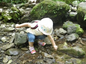 ケーブルカーを降りて木に覆われた山道を行くと渓流が現れます。