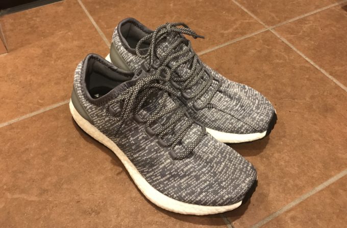 ②アディダス pure boost 。ナイキの厚底が出るまでは世界記録を更新し続けた高反発素材ブーストを使用、衝撃を吸収しながらもしっかり反発 ナチュラルラン用で靴の中敷きは使用せず靴の中はフラットかつソールドロップ8ミリ。