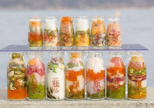 海鮮丼の中身が昔よくあった牛乳瓶に詰め込んである一品です!