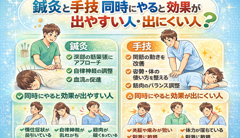 結論から言うと、鍼灸と手技を同時に行うことで効果が出やすい方もいれば、逆に出にくい方もいます。