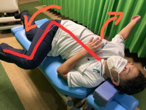 上半身は反対を向くことで、背骨周囲の筋肉をゆるめます。