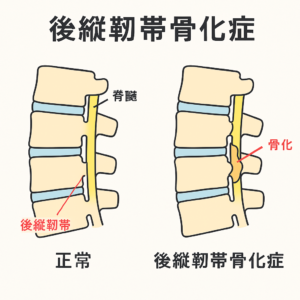 後縦靭帯骨化症とは、背骨の内側にある「後縦靭帯」が骨のように硬く変化することで、神経を圧迫してしまう疾患です。その結果、痛みやしびれ、運動障害が生じます。