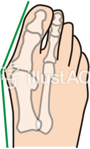 親指の付け根の関節(MTP関節)で指先が外側に向き、足の付け根が内側を向いて(くの字に)変形することを言います。(下図参照)