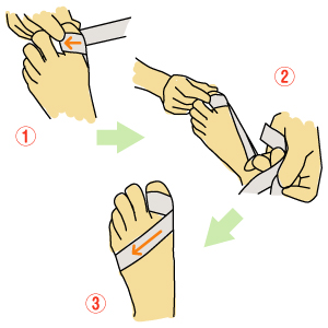 変形部分をテーピングを用いて固定・圧迫を行うと日常生活での負担を軽減します。