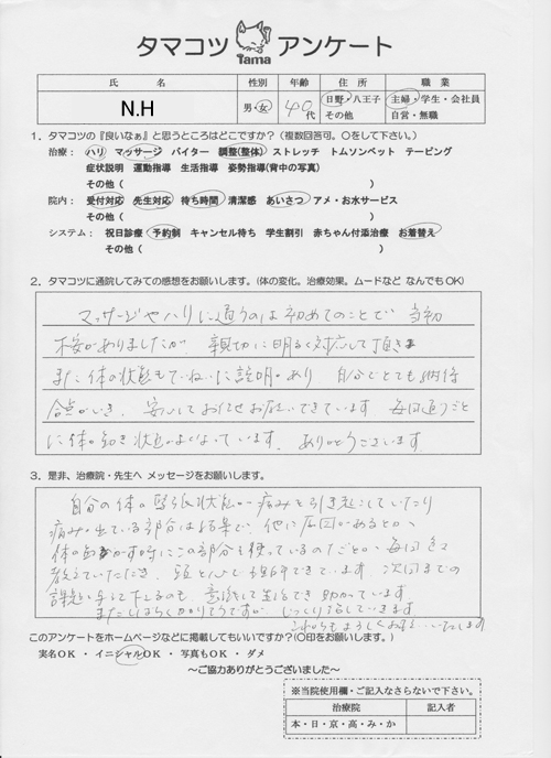 マッサージやハリに通うのは初めてのことで当初不安がありましたが、親切に明るく対応して頂き、また体の状態もていねいに説明があり自分でとても納得合点がいき、安心してお任せお願いできています。毎日通うごとに体の動き状態がよくなっています。ありがとうございます。