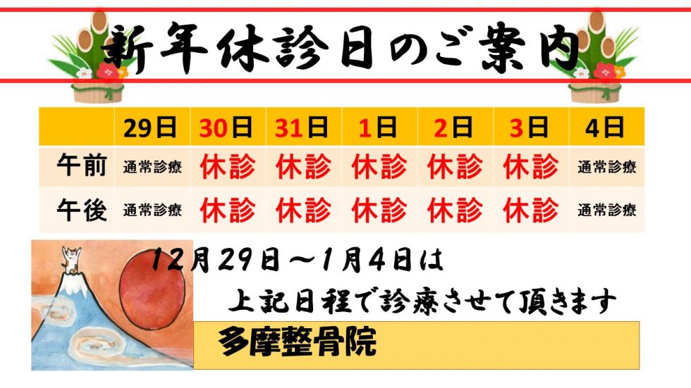 さて、タマコツの年末年始の診療日程のご案内です。