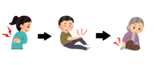 日常生活動作では痛みは感じないが、指圧すると痛むところがあるという段階です。筋硬結が出来ている状態に強いストレスが加わったり、慢性的に阻血状態が続いたりすると、治癒力が失われて次の段階へと悪化します。