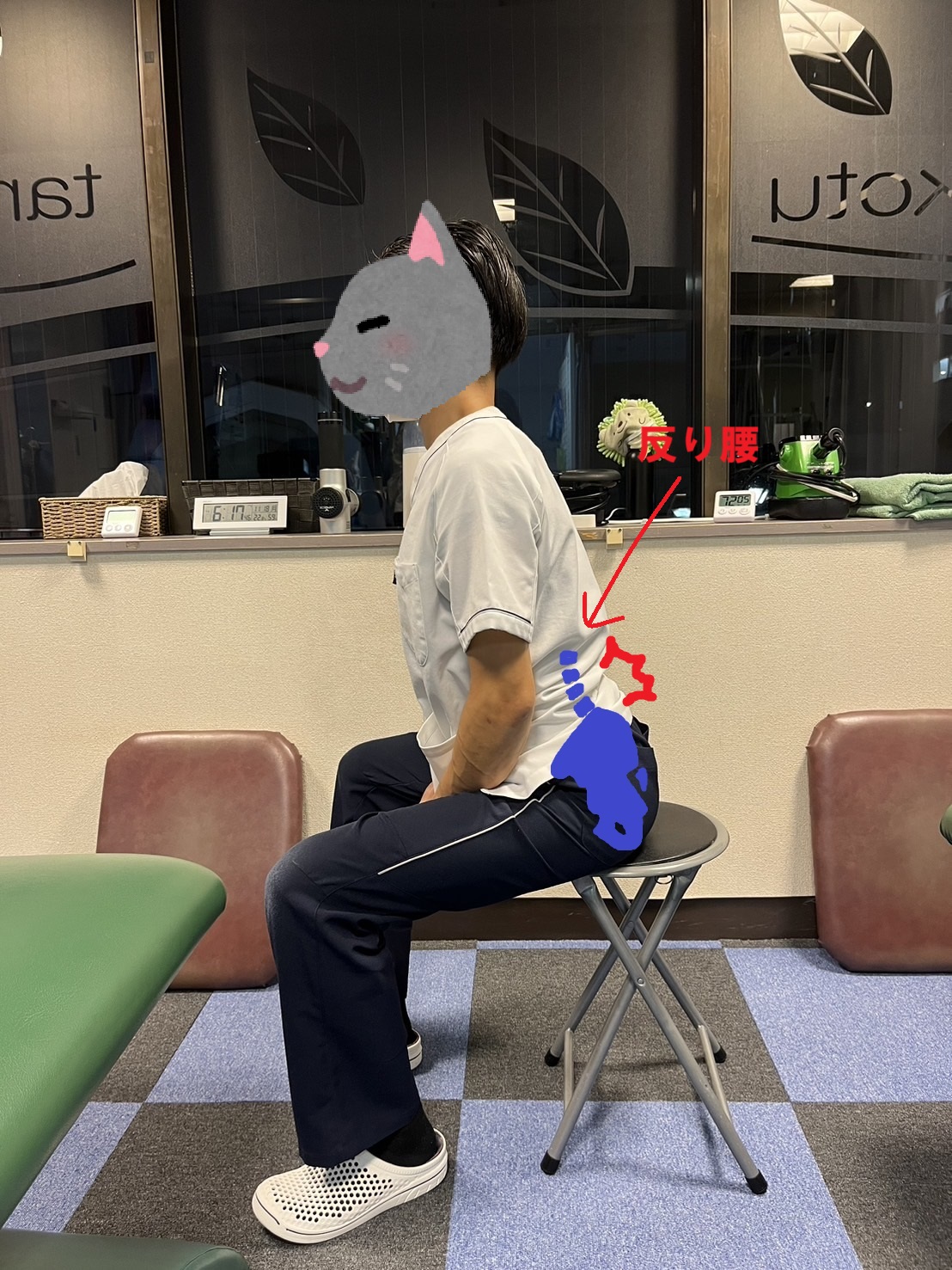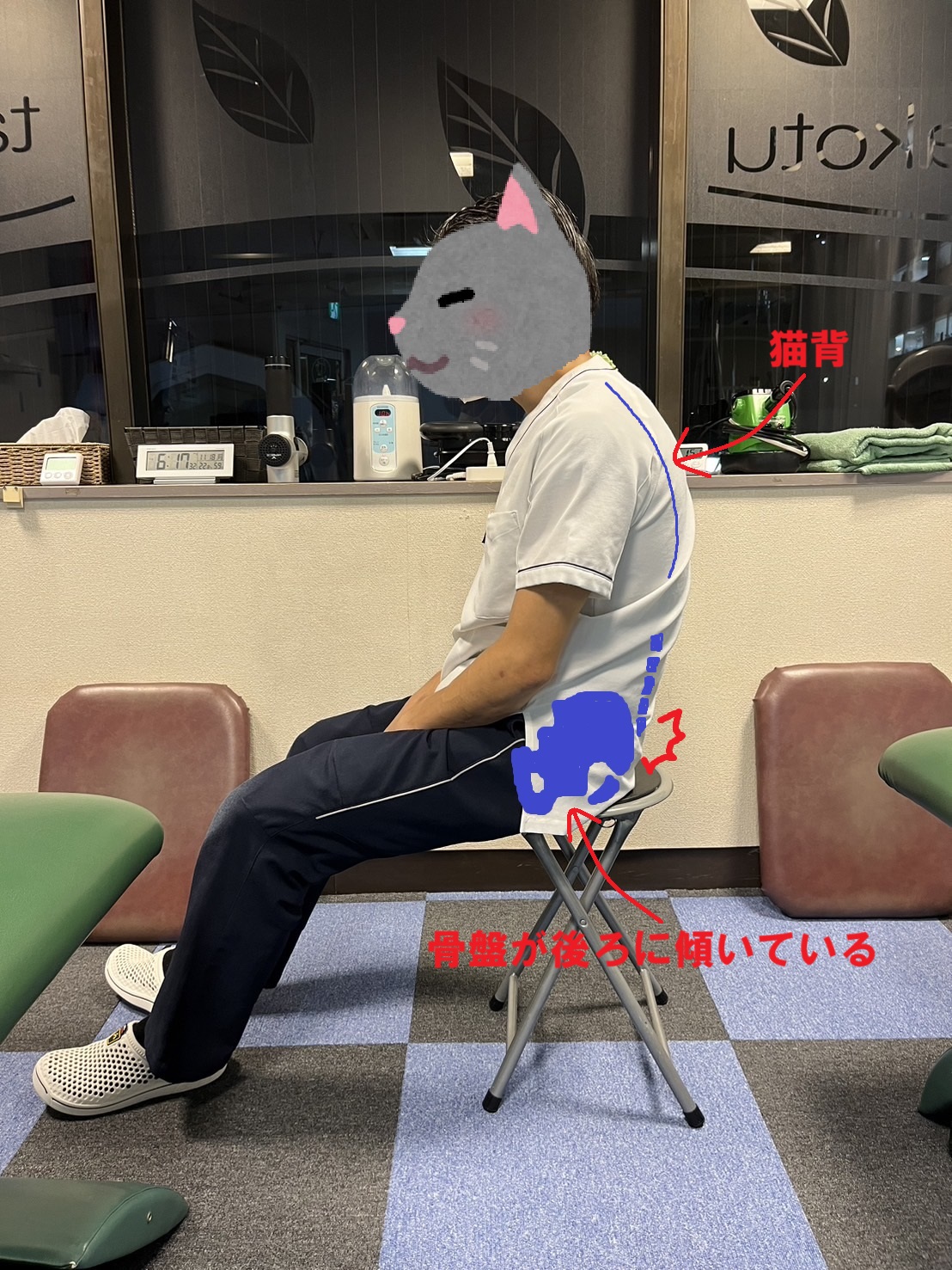 非構造的要因とは具体的には筋力低下や、姿勢不良によるもののことをいいます。筋力の低下によって正しい姿勢を保つ事が難しくなると、坐骨神経に負担をかけるような姿勢になりやすいです。たとえば下記の写真のように骨盤が倒れている状態が長時間続くと坐骨神経痛になりやすいといわれています。
