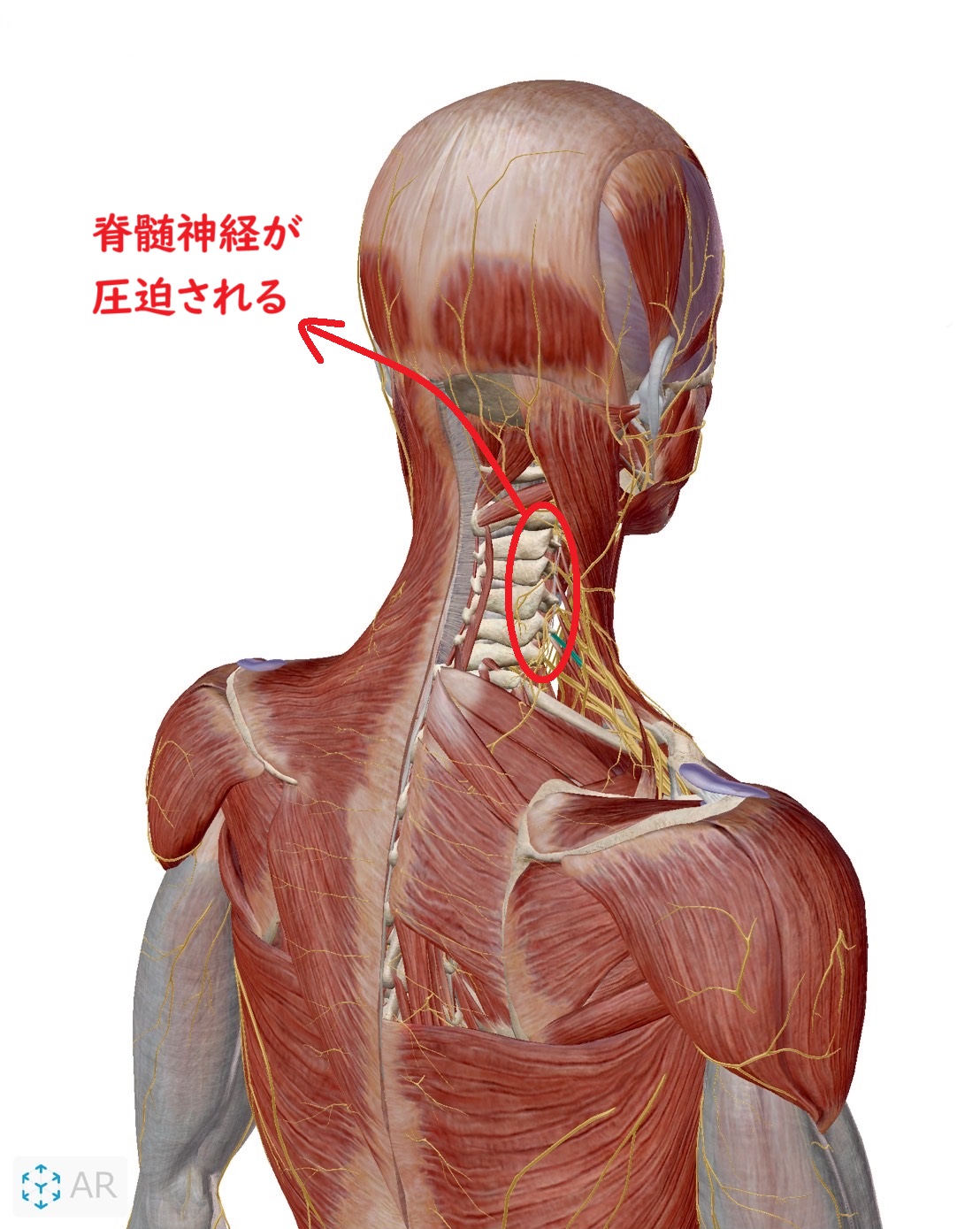 頚椎症と頸椎椎間板ヘルニアは厳密に言えば圧迫される場所の違いはありますが、共通して言えることは神経根と呼ばれる神経の根元が圧迫されて出る症状です。圧迫される場所によって痺れを感じる場所が違うのが特徴です。