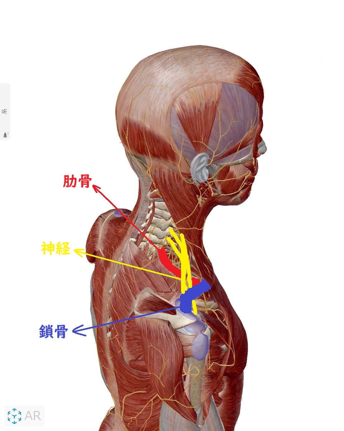 肋鎖症候群とは肋骨と鎖骨の間を通る神経が圧迫されて出る症状です。
