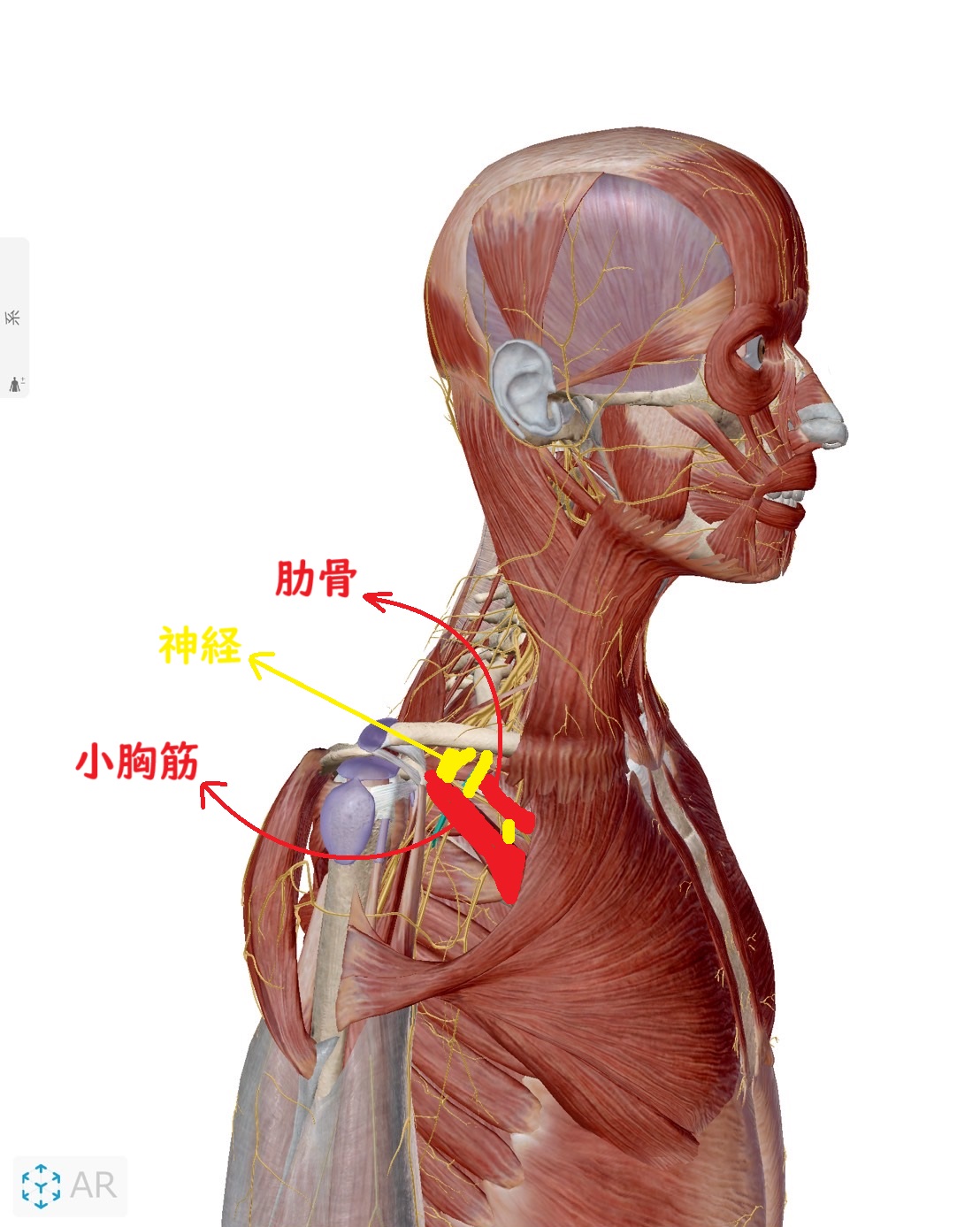 過外転症候群とは小胸筋と肋骨の間で神経が圧迫される症状です。