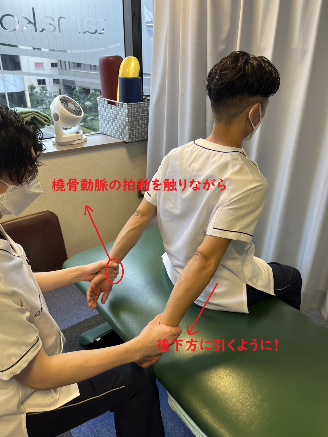 ②手首を持つようにして、腕を後ろに引くように動かす。