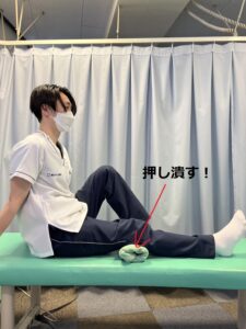 コチラは大腿四頭筋のトレーニングになります。平らな地面に足を伸ばすように座ります。鍛えたい足の膝裏にタオルを丸めるなどした、クッション性のある物を入れます。それを膝裏で押し潰すイメージで、筋肉に負荷を与えます。関節のバランスを保たせ、膝の怪我を予防します。