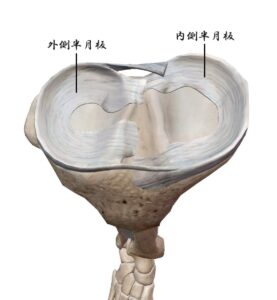 半月板は大腿骨と脛骨の間にある組織のことをいいます。この組織は外側半月板と内側半月板の2つあり、形はC型をしています。それぞれ関節の安定性と荷重時のクッション作用を担っている大切なパーツになります。