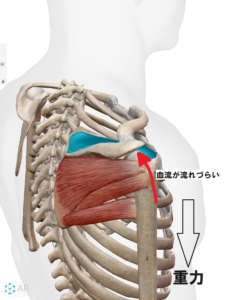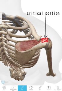 棘上筋はほかの筋肉よりも血流が流れづらい部分があります。この部分をcritical portion(虚弱な部分)と呼びます。さらに、棘上筋は常に重力に逆らうような動きをしているので、より血流が悪くなりやすいです。