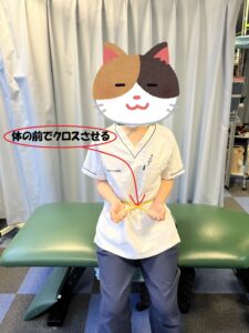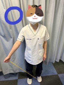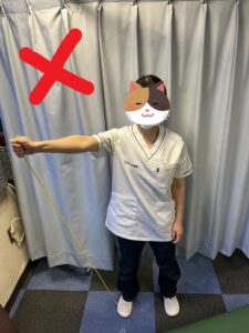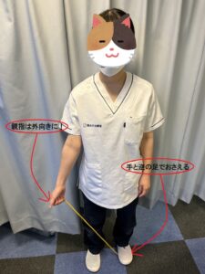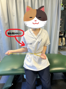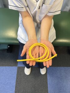 ②逆の手でゴムチューブの端を持ちます。この時、親指を上にして持つようにしましょう。