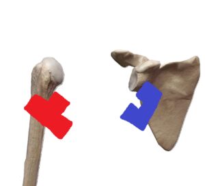 肩甲上腕関節は上腕骨の上腕骨頭が凸、肩甲骨の関節窩が凹で関節になっています。上腕骨頭は球状になっているため、球関節と呼ばれています。股関節も球関節に分類されます。球関節で特徴的なのが他の関節と違って可動域が広いことです。しかし可動域が広い反面、不安定でほかの関節よりも脱臼しやすい構造になっています。特に肩関節の場合、関節窩が浅い構造になっているため、股関節よりも不安定になっています。