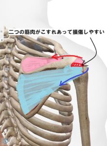 腕を動かす際に二つの異なる動きをする筋肉がこすれあうことによって、損傷しやすい状況になります。このことから、腱板断裂は棘上筋に起きやすいですが、棘上筋と重なっている棘下筋も損傷しやすいと言えます。