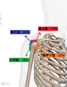 なぜ痛みを感じにくいかというと4種類の腱板のうちの肩甲下筋が働いているからです。腱板のうちの53%は肩甲下筋が働いているため、肩甲下筋自体を損傷していないことに加えて、きちんと肩甲下筋を使えていれば痛みを感じにくいです。