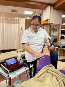 炎症が起きている膝の患部には、超音波と電気を同時に使う「コンビネーション施術」を行います。
