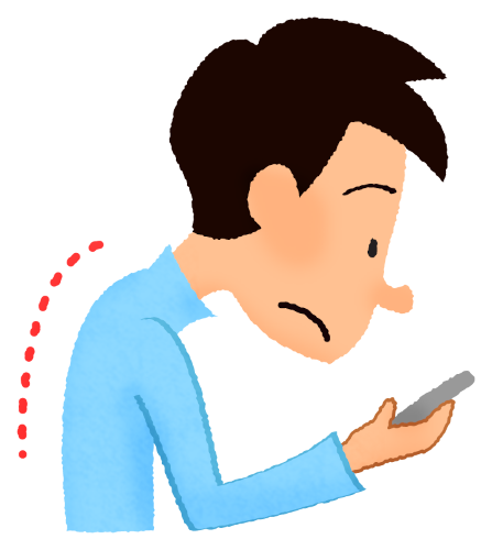 デスクワークやパソコン、スマホ、ゲームなど長時間にわたって同じ姿勢をすることで、胸よりも首と頭が前に突き出た状態で筋肉が固まってしまいます。運動不足が続くことで背中の筋肉が弱り、やがて頭を支えられなくなるのも大きな原因です。