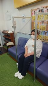 皆さんが滞在する待ち合いにパーテーションを各ソファーごとに設置しました。