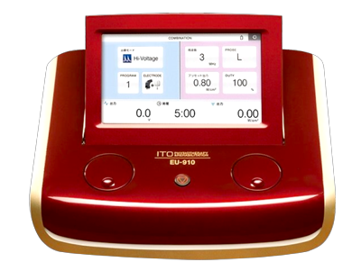 この機械は、高電圧電流による電気刺激を皮膚に抵抗を与えずに深部組織まで到達させ直接患部の炎症を抑え、痛みの軽減・治癒力促進を促します。従来の電気治療法に比べ、身体の奥深い患部への直接のアプローチができるため、非常に高い鎮痛効果と即効性が望めます。