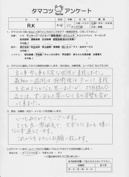 最初の二週間は施術後はダルくて、来院を止めようかなと思いましたが、2ヶ月弱の今迄では、ずいぶんと楽になり、立ち姿勢も変わって来ました。