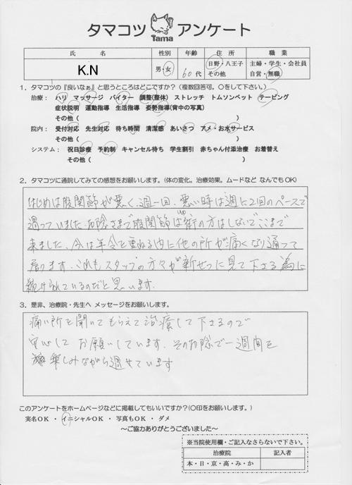 はじめは股関節が悪く、週一回、悪い時は週に2回のペースで通っていました。お陰さまで股関節は手術の方はしないでここまで来ました。今は年令を重ねる内に他の所が痛くなり通って居ります。これもスタッフの方々が新せつに見て下さる為に続けられているのだと思います。