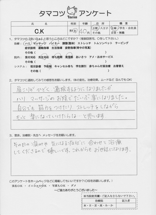 肩こりがひどく、通院するようになりましたが、ハリ・マッサージのお陰でだいぶ楽になりました。