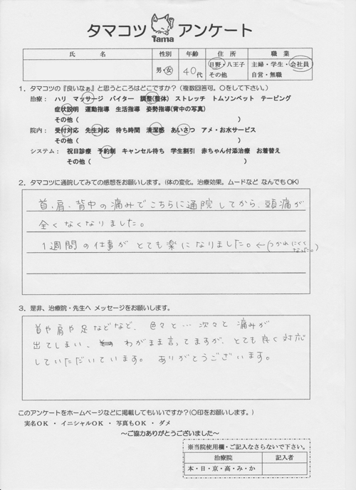 首・肩・背中の痛みでこちらに通院してから、頭痛が全くなくなりました。
