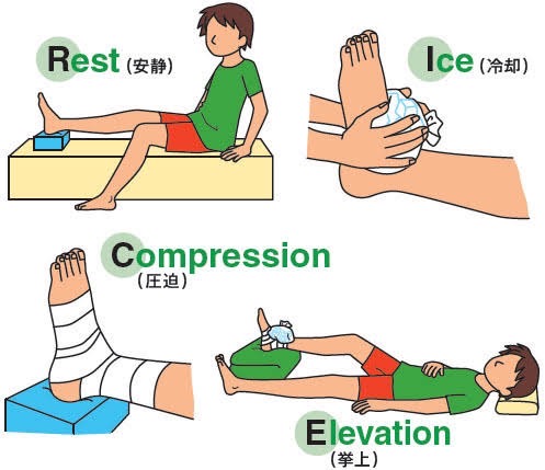 受傷から48~72時間の炎症期は安静・冷却・圧迫・挙上(RICE処置)が基本になります。