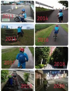 遠くに行くことに目的を定める息子は、都庁や東京タワー、羽田空港にはずぶ濡れで彷徨い観光客の注目を浴び、お台場には漕げると思ったレインボーブリッジを自転車曳きながら渡りました。横浜、新橋、鎌倉と。コロナ時期は朝霞や川越へ。