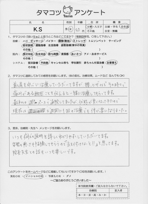 首と肩を中心に治療していただいていますが、腰・膝などその時々で痛みがあることを伝えると一緒に治療してもらえます。